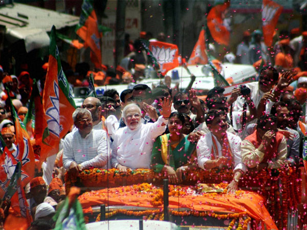 Narendra Modi leads 2 km roadshow to Varanasi Collectorate office, to file his nomination shortly.
