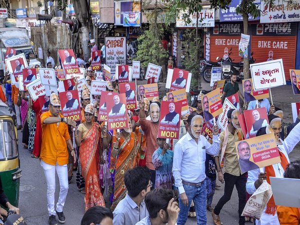 Surat: Supporters of BJP wear masks of PM Narendra Modi during election a campaign rally, ahead of Lok Sabha polls, in Surat, Sunday, April 07, 2019.