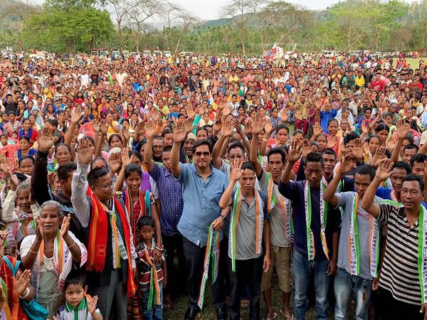 East Garo Hills: Meghalaya chief minister and President of National People's Party (NPP) Conrad K Sangma with the supporters at an election rally in support of party candidate for the Tura parliamentary constituency Agatha K. Sangma ahead of the Lok Sabha election, at East Garo Hills, Monday, April 1, 2019.
