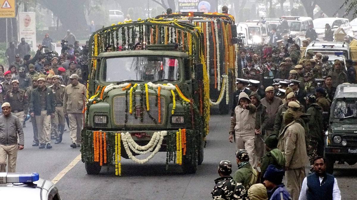 Dr. Singh's body, draped in the Indian flag, was taken through the streets of Delhi. Following the Sikh traditions, priests chanted hymns at Nigambodh Ghat before Singh's daughter, Upinder Singh, lit the funeral pyre.