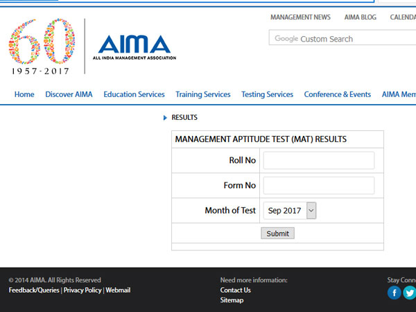 MAT September 2017 paper-based test was conducted on September 3rd 2017 and the computer-based test was taken on September 9th 2017. The results are available on apps.aima.in/mat_input_result.aspx.