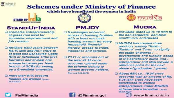 New Delhi, Mar 08: Ministry of Finance, in the past seven years has launched various Schemes which have special provisions for empowerment of women. These Schemes have financially empowered women to lead a better life and chase their dreams of being an entrepreneur.