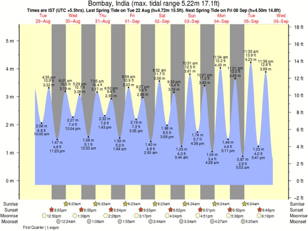 Tide chart for Mumbai showing low and high tide times for the next 7-day.