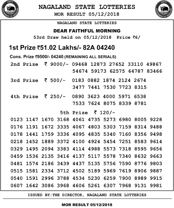 The Nagaland Lotteries today December 5 2018 results will be declared today. The results once declared will be available on the official website.
