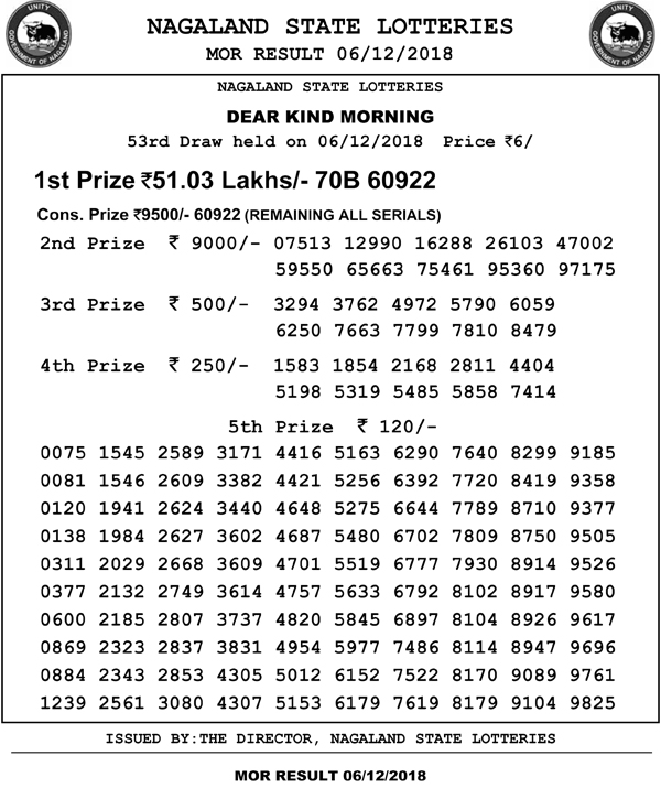 The Nagaland Lotteries today December 6 2018 results have declared today. The results are available on the official website.