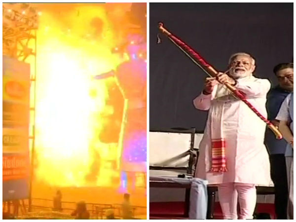 Narendra Modi burns effigy of Ravana during Dussehra celebrations at Ramlila Maidan