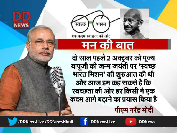 "I started Swachh Bharat campaign two years back on the occasion of Bapu Jayanti (Mahatma Gandhi's birth anniversary). With the help of this campaign, awareness about cleanliness among 125 crore people of the country has increased," Modi said in his monthly radio broadcast 'Mann ki Baat'.