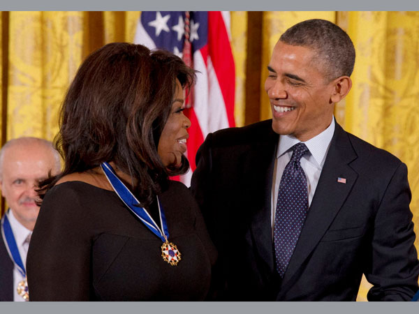 President Barack Obama talks with Oprah Winfrey after presenting her with the Presidential Medal of Freedom