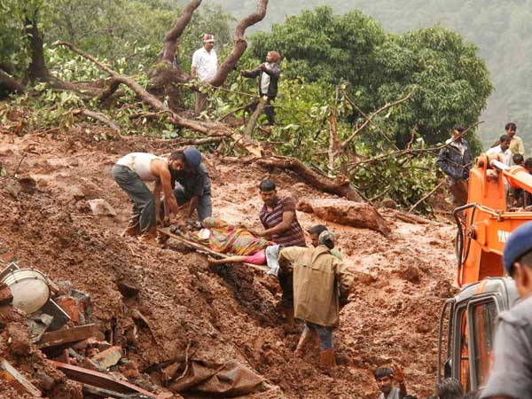Rescue workers carry the body of a victim at the site of a landslide in Malin village, in Maharashtra on Wednesday. Torrential rains triggered a massive landslide that buried a remote village in western India.