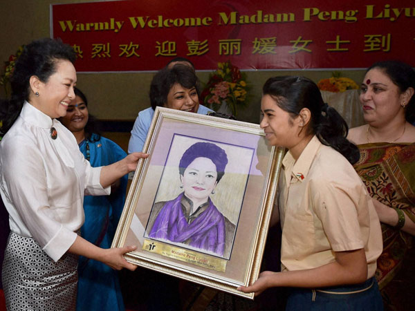China's first lady Peng Liyuan is presented with a portrait of her by a student during her visit to the Tagore International School in New Delhi on Thursday.