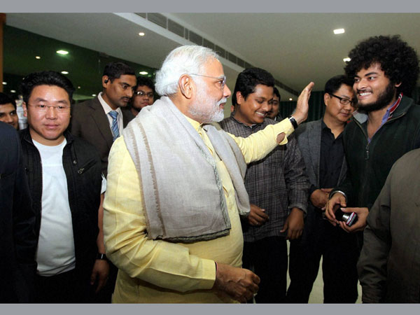 BJP'S Prime Ministerial candidate Narendra Modi interacts with North East students during a meeting in New Delhi on Wednesday.