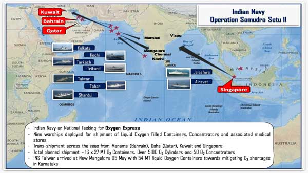 The deployment of nine warships as part of 'Operation Samudra Setu II' forms a part of the multiple lines of effort, by the GoI and the Indian Navy to supplement the oxygen requirement in the country.