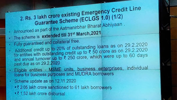 Guaranteed credit support for 26 stressed sectors identified by the Kamath Committee. Original ECLGS had one year of moratorium and 4 years of repayment, the new scheme will have 1-year moratorium and 5 years of repayment.