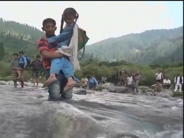 "J&K: In absence of a bridge, students and locals from four villages risk their lives to cross the Tawi river in Udhampur's Kirchi," tweeted ANI.