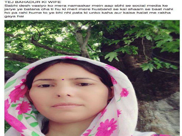 Introducing herself as Tej Bahadur's wife she says "Sabhi desh vasiyo ko mera namaskar mein aap sbhi se social media ke jarye ye batana cha ti hu ki meri mere husband se kal shaam se baat nahi ho pa rahi hume to ye bhi nhi pata ki unko kaha aur kaise halat me rakha gaya hai." ( Greetings to all Indians. I want to say through social media that I have not spoken to my husband since Tuesday evening. I do not know where he is and in what condition he is).