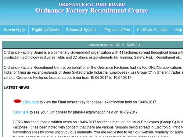 OFRC result final answer key released on ofbindia.gov.in