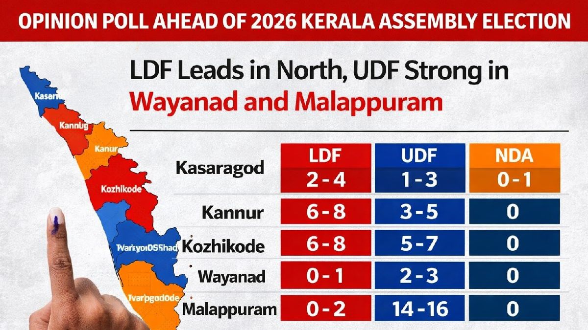 The Manorama News-C-Voter Kerala Assembly polls 2026 survey points to a mixed picture in north Kerala, with the Left Democratic Front (LDF) retaining clear strength in Kasaragod and Kannur, while the United Democratic Front (UDF) is placed ahead in Wayanad and strongly favoured in Malappuram, with Kozhikode turning competitive.
