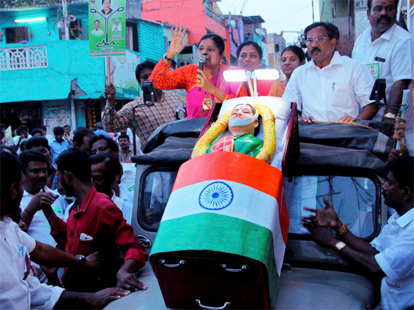 The Chennai police on Monday filed FIRs against two leaders of the AIADMK's O Panneerselvam camp. M Pandiarajan and Azhagu Tamil Selvi were booked for parading replica of late Jayalalithaa's coffin. Both leaders were seen using the mock coffin to campaign for the R K Nagar bypoll.