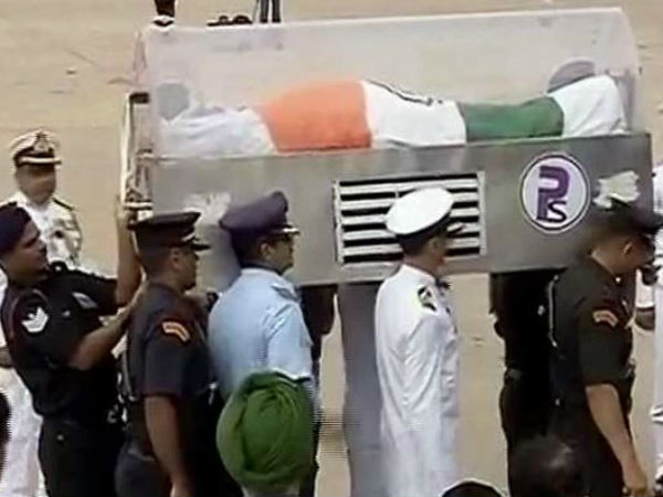The People's President's body, draped in the Indian tricolour was brought to the burial site at Pei Karumbu in a flower-bedecked gun carriage, escorted by columns of the three armed services.