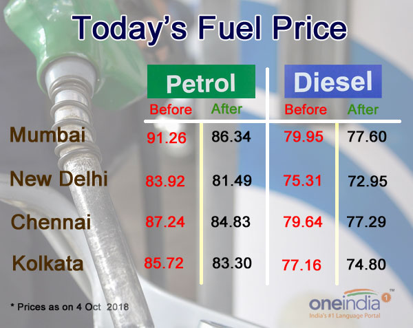 New Delhi, Oct 4: Finance Minister Arun Jaitley announced a cut of R s 2.50 percent in fuel prices. "Oil marketing companies will absorb Rs 1 from the central govt cut on 2.50 relief on petrol and diesel," he said.