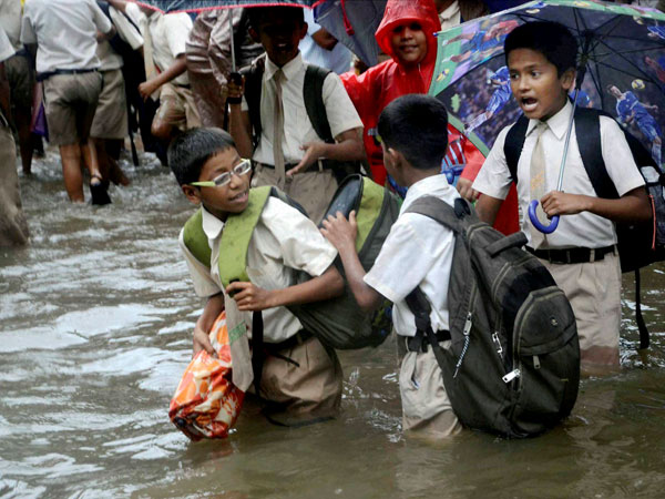 School children wading through a waterlogged street after heavy rains in Mumbai on Friday.