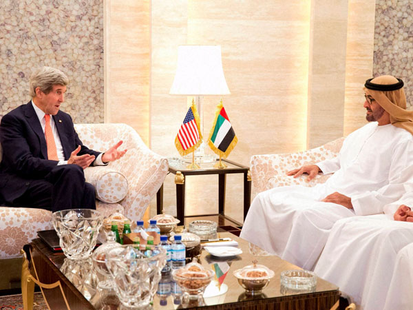 Secretary of State John Kerry meets with Crown Prince Sheikh Mohammed Bin Zayed Al Nahyan at the Mena Palace in Abu Dhabi, Monday, Feb. 17, 2014.