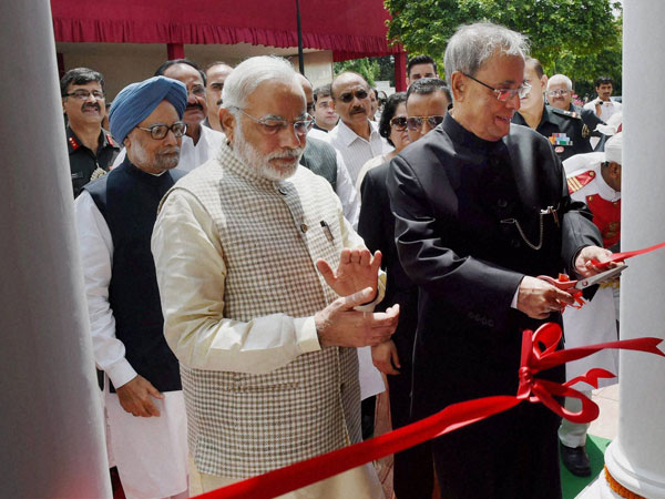 Flanked by Modi on one side and former Prime Minister Manmohan Singh along with his wife Gursharan Kaur on the other, Mukherjee cut the ribbon of the museum which has been dedicated to people of the country as part of the President's initiative to make Rashtrapati Bhavan people-friendly.