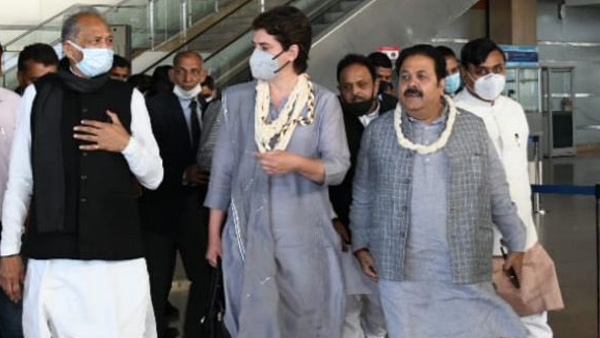 The Congress General Secretary, who was accompanied by party leader Rajeev Shukla, was received by Mr Gehlot, state Congress chief Govind Singh Dotasra and others at the airport in Jaipur, PTI reported.