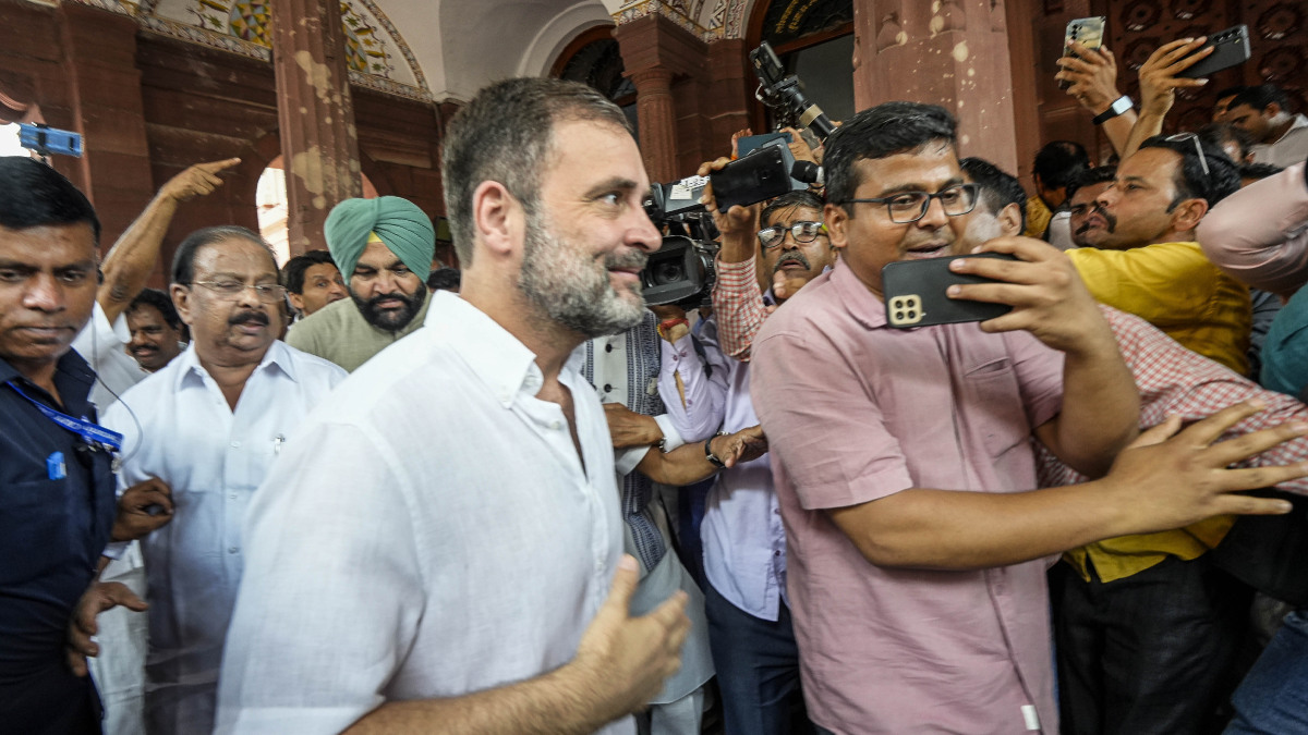 Rahul reached the Parliament House complex around 12 noon and headed straight to the Mahatma Gandhi statue and paid floral tributes. Congress MPs and those of the opposition INDIA bloc welcomed him at the gate number one of Parliament raised slogans.