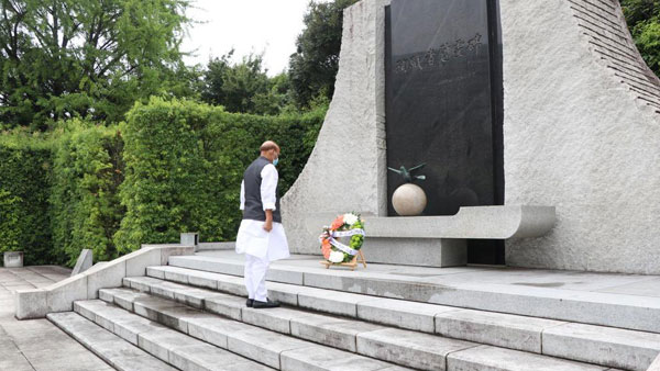 News Delhi, Sep 08: Defence minister Rajnath Singh, who is in Japan for the second India-Japan 2+2 Ministerial Meeting, laid a wreath today, i.e Thursday, at the memorial dedicated to the country's Self Defence Forces at the Ministry of Defence, Japan.