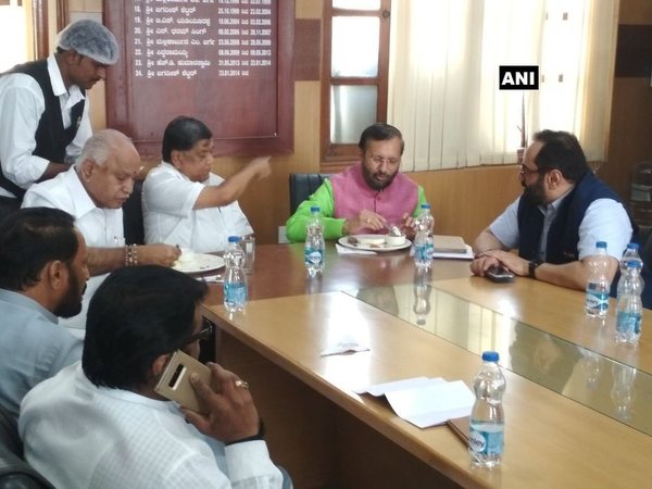 Senior BJP leaders Prakash Javdekar, BS Yeddyurappa and party's Rajya Sabha candidate Rajeev Chandrashekar at their party office in Vidhan Soudha.