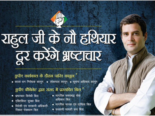 The slogan of the campaign is "Rahul ji ke nau hathiyar, door karenge bhrashtachar" (Rahul ji's nine weapons will end corruption).