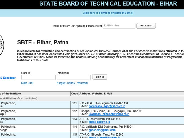 SBTE had organized these exams in December 2017, last year. Although a notification on http://sbteonline.in/ read, 'Results are now available for Sem - I/II, III & V (OLD/NEW Syllabus) Exam - 2017(ODD), held in Dec-2017.'; however only the results of Semester I 2017 (Even) regular and compartmental along with Semester II 2017 (Even) regular and compartmental are available on the official website. The results are available on http://sbtebihar.gov.in.