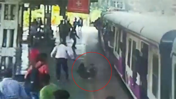 The footage from the CCTV camera shows an RPF personnel bending on a railway platform and pulling the child to the platform, just seconds before a train rushes past them.