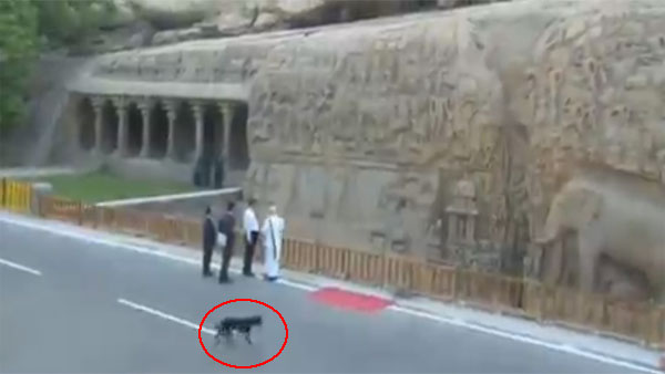 PM Modi was seen explaining the finer details of the motifs in the Arjuna's Penance to the Chinese President when a dog was seen entering the place and crossing them.