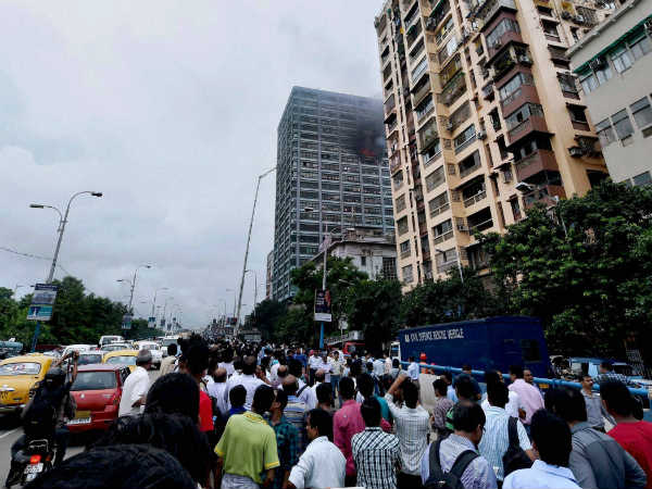 Commuters watch as a fire broke out at a building in Kolkata on Tuesday morning.