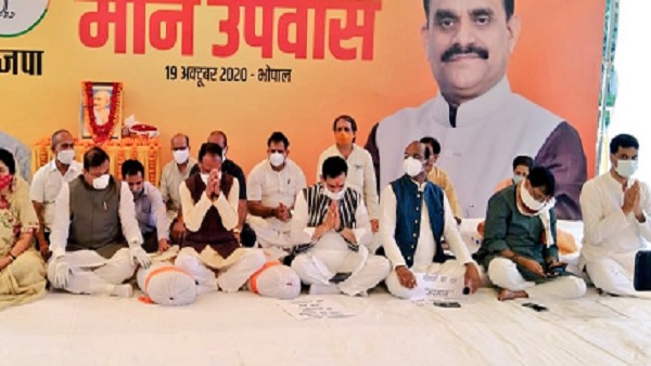 Madhya Pradesh CM, along with state ministers Narottam Mishra, Bhupendra Singh, Vishwas Sarang and some women members of the BJP began the 'maun vrat' (silent fast) at Minto Hall in Bhopal at 10 am.