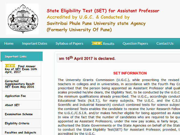 The examination is accredited by the university grants commission (UGC) and conducted by Savitribai Phule Pune University state Agency (Formerly University Of Pune). Almost, 69200 candidates appeared for the test that was held in April 2017. The results are available on setexam.unipune.ac.in.