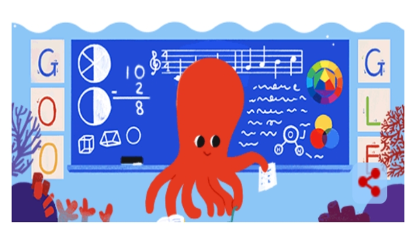 The doodle shows a red, animated octopus standing against a blackboard, using its tentacles to solve math equations, read, conduct experiments and, make notes.
