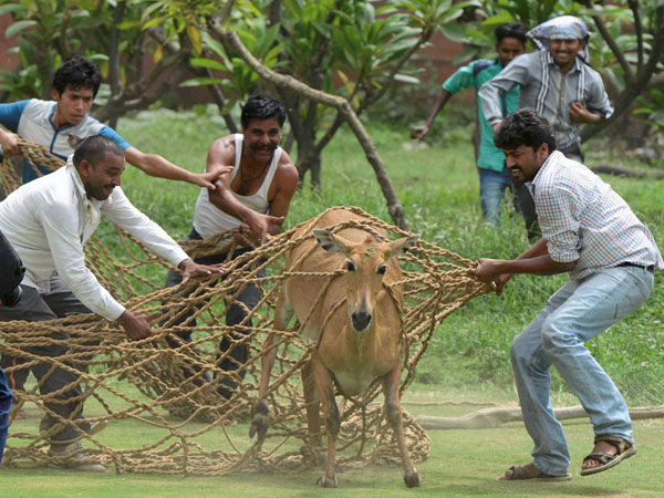 New Delhi, May 26: A "hyperactive and terrified" Nilgai that caught everyone's attention while running frenzied near Parliament House -- one of the most secured zones of Delhi -- was successfully rescued without using tranquilisers in a four-hour long operation on Thursday.