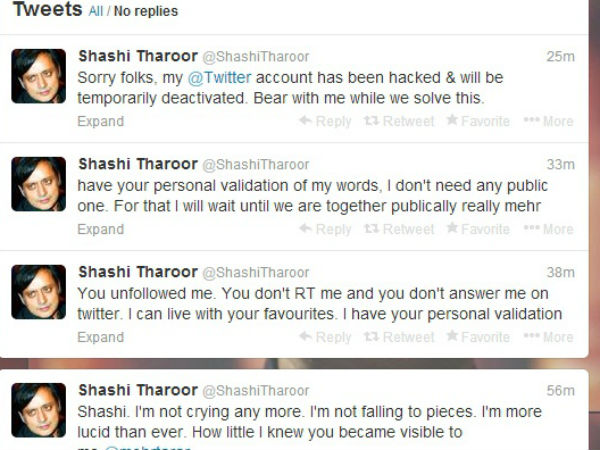 Tharoor later clarified that his account was hacked. Some of the messages were very bizarre that they were retweeted by many people. "@mehrtarar I love you, Shashi Tharoor. And I go while in love with you, irrevocably, irreversibly, hamesha. Bleeding, but always your Mehr", read one of the tweets.