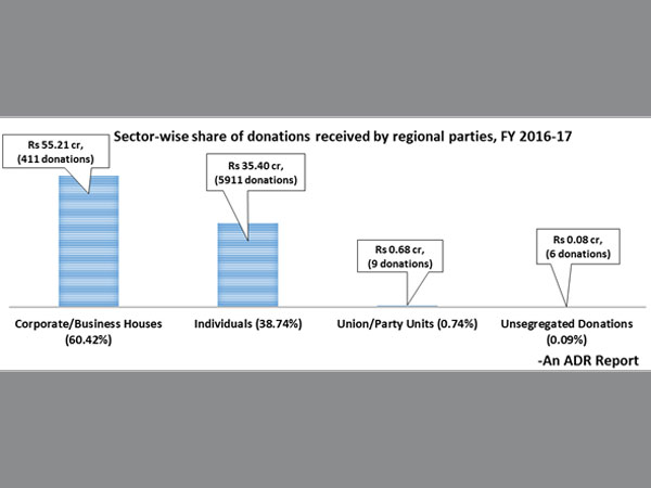 - 60.42% of all known donations amounting to Rs 55.21 cr were received via 411 donations to Regional Parties from corporate/business houses in FY 2016-17. 38.74% amounting to Rs 35.4 cr were received via 5911 donations from Individual donors during the same time.