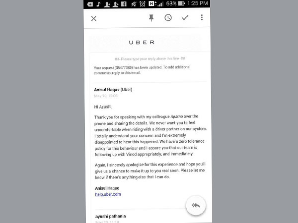 Meanwhile, Mr Gagan Bhatia, the General Manager, Uber Delhi told OneIndia, in his statement, sent through a mail, "Our team immediately reached out to the rider via phone within a few minutes of receiving the feedback. Multiple members of the Uber team have spoken with the driver."