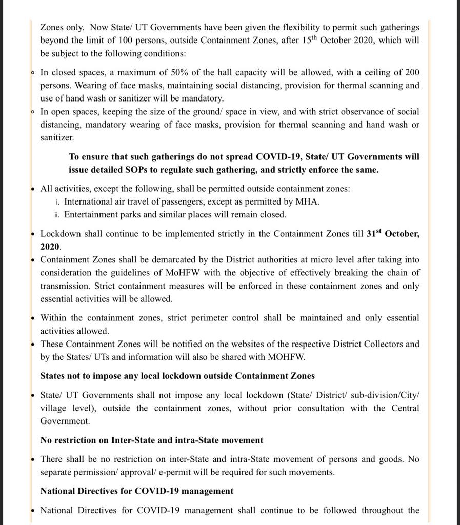 New Delhi, Sep 30: The ministry of home affairs has announced a detailed guidelines of Unlock 5, to be effective from October 1, shortly. The cinema halls multiplexes, swimming pools used for training of sportspersons, entertainment parks to re-open from 15th October 2020.