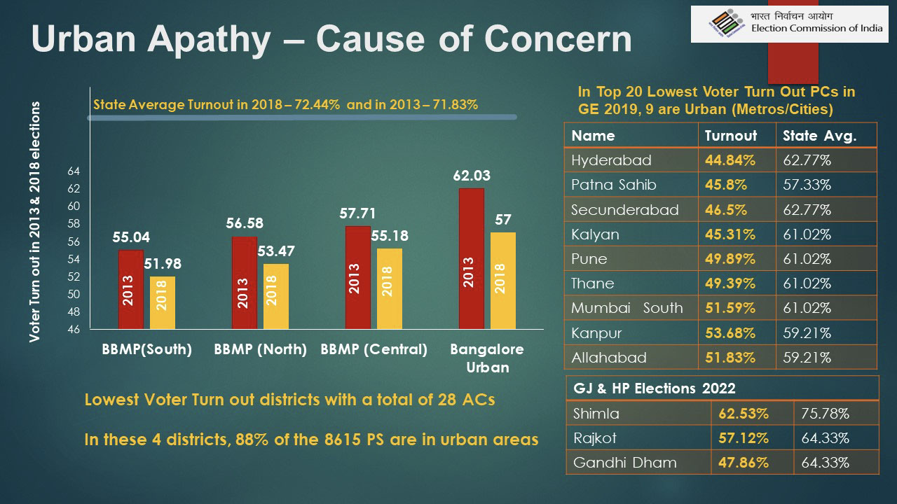 Sharing the status of urban apathy in Karnataka, Chief Election Commissioner Rajiv Kumar said four districts in Bengaluru, India's IT hub, saw the lowest voter turnouts in the State in 2013 and 2018.