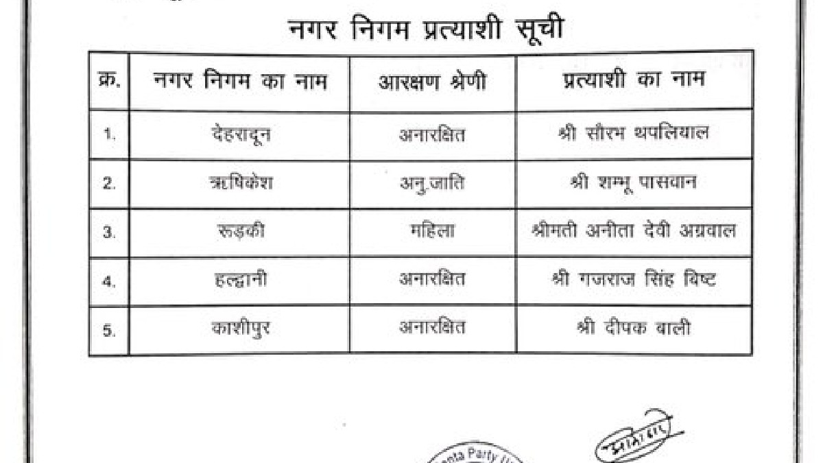 The Bharatiya Janata Party ( BJP) has unveiled its complete list of candidates for the upcoming Uttarakhand Municipal Elections 2024-25, covering all 11 mayoral seats.