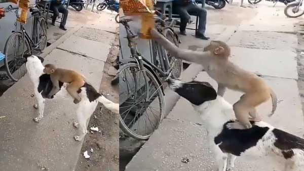 In the viral clip, a natorious monkey is seen stealing a packet of chips from a shop by standing onhe dog's back.