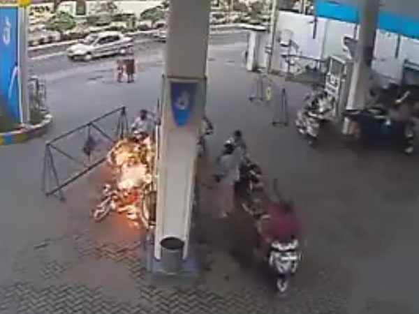 In the video, a biker was seen entering the petrol pump. The moment he started using his mobile phone, his motorbike caught fire. However, he along with staffs of the petrol pump succeeded to douse the fire.
