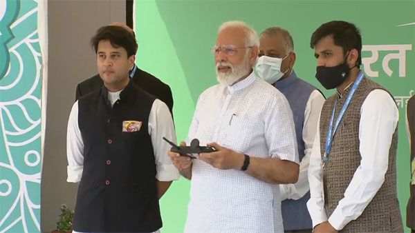 New Delhi, May 27: Prime Minister Narendra Modi today inaugurated India's biggest Drone Festival - Bharat Drone Mahotsav 2022 today. He also interacted with Kisan drone pilots, witnessed open-air drone demonstrations and interacted with startups in the drone exhibition centre. Union Ministers Narendra Singh Tomar, Giriraj Singh, Jyotiraditya Scindia, Ashwini Vaishnaw, Mansukh Mandaviya, Bhupendra Yadav, many Ministers of State and leaders and entrepreneurs of drone industry were among those present on the occasion. The Prime Minister also gave away 150 drone pilot certificates.