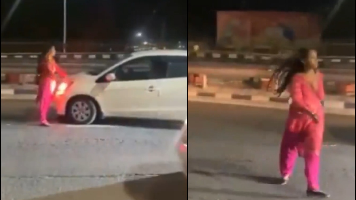 The woman, believed to be in her 30s, continues walking down the road as others watch from a distance. Her face is not clearly visible in the video. Due to her actions, several cars had to stop suddenly. In the confusion, two cars behind her were involved in a minor accident when one bumped into the other.